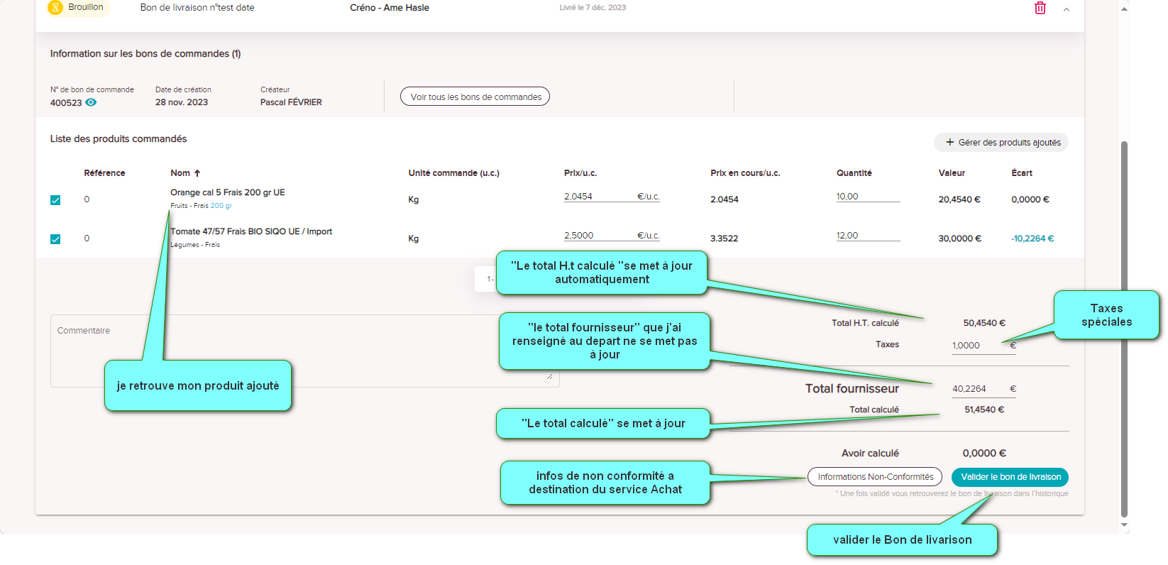 - le "Total fournisseur" que j'ai renseigné à la création du bon ne se met pas à jours automatiquement,
