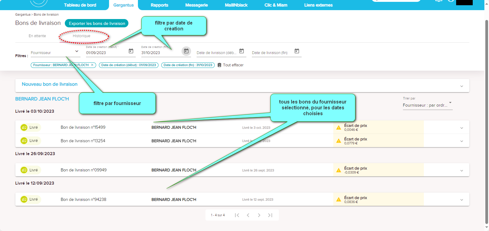 Sur la partie "historique", je vois l'ensemble des bons de livraison du mois en cours, je peux