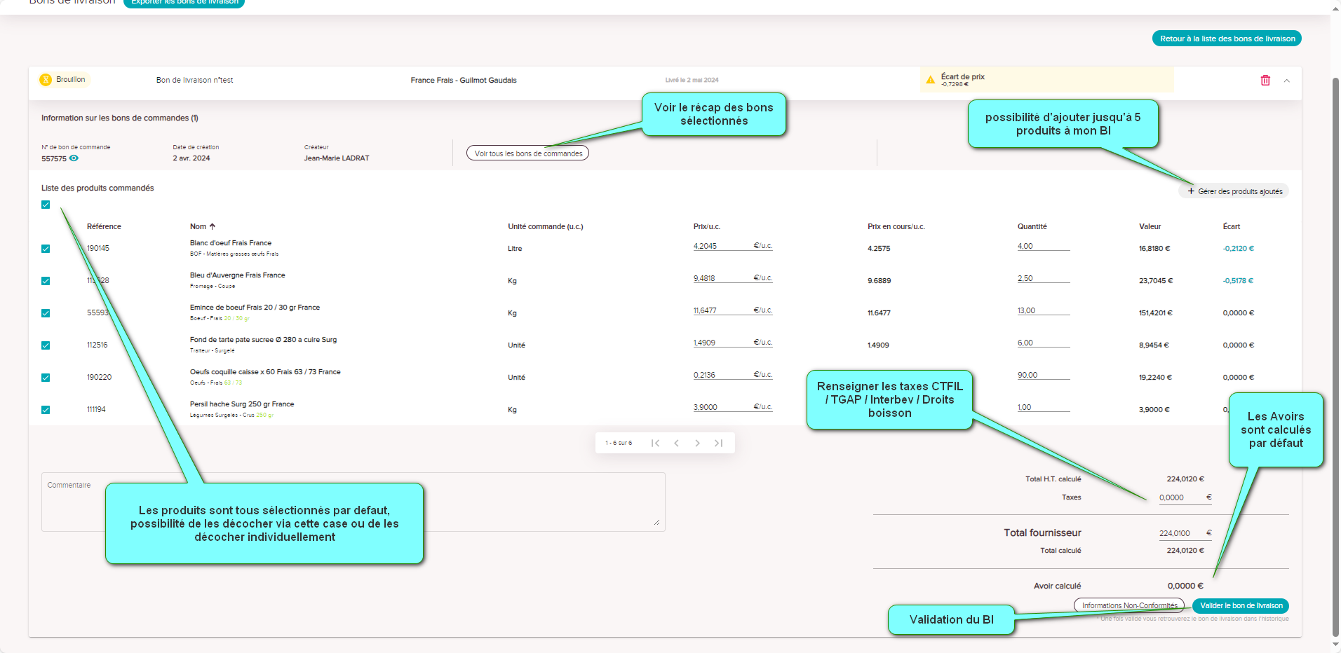 Au clic "Valider l'ajout de produits" je reviens sur mon Bon de livraison