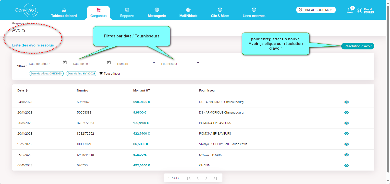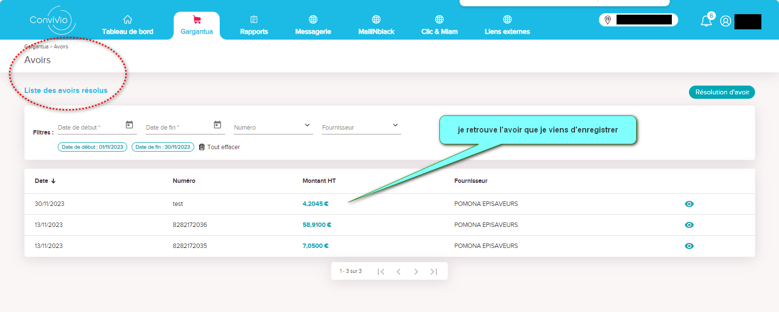une fois validé je reviens sur la page d'accueil Avoir / Liste des avoirs résolus