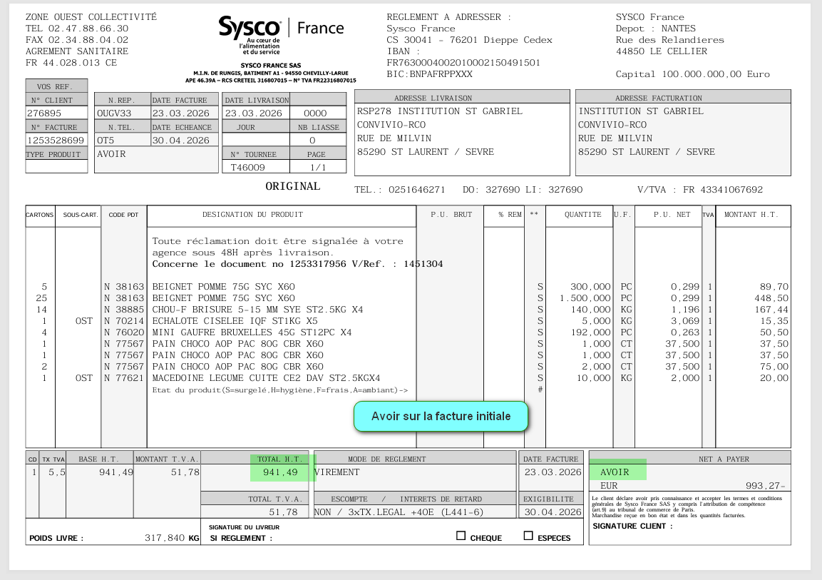 Dans cet exemple le fournisseur a fait un Avoir global de la facture pour un problème d'écart de prix sur un produit