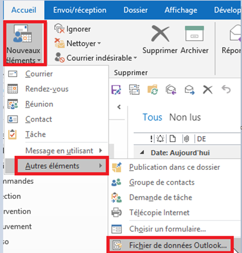 - Accueil -> Nouveaux élements -> Autres éléments -> Fichier de données Outlook…