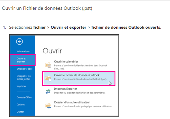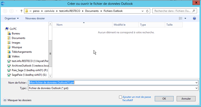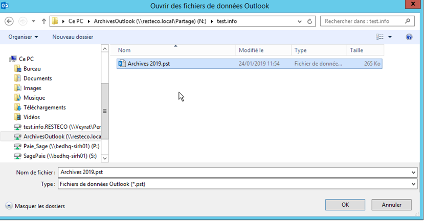 Se déplacer sur « ArchivesOutlook » dans votre dossier personnel et sélectionner le fichier à ouvrir.