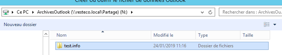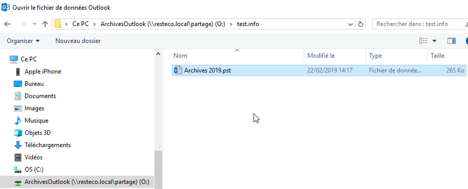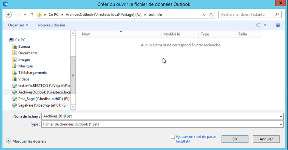 Cliquez sur « Parcourir... » Et sélectionner le fichier Outlook préalablement crée (ArchivesOutlook\prenom.nom\Archives 2019.pst)