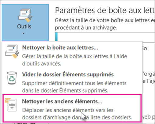- Dans Outlook 2016 : Cliquez sur Fichier > Informations > Outils > Nettoyer les anciens éléments