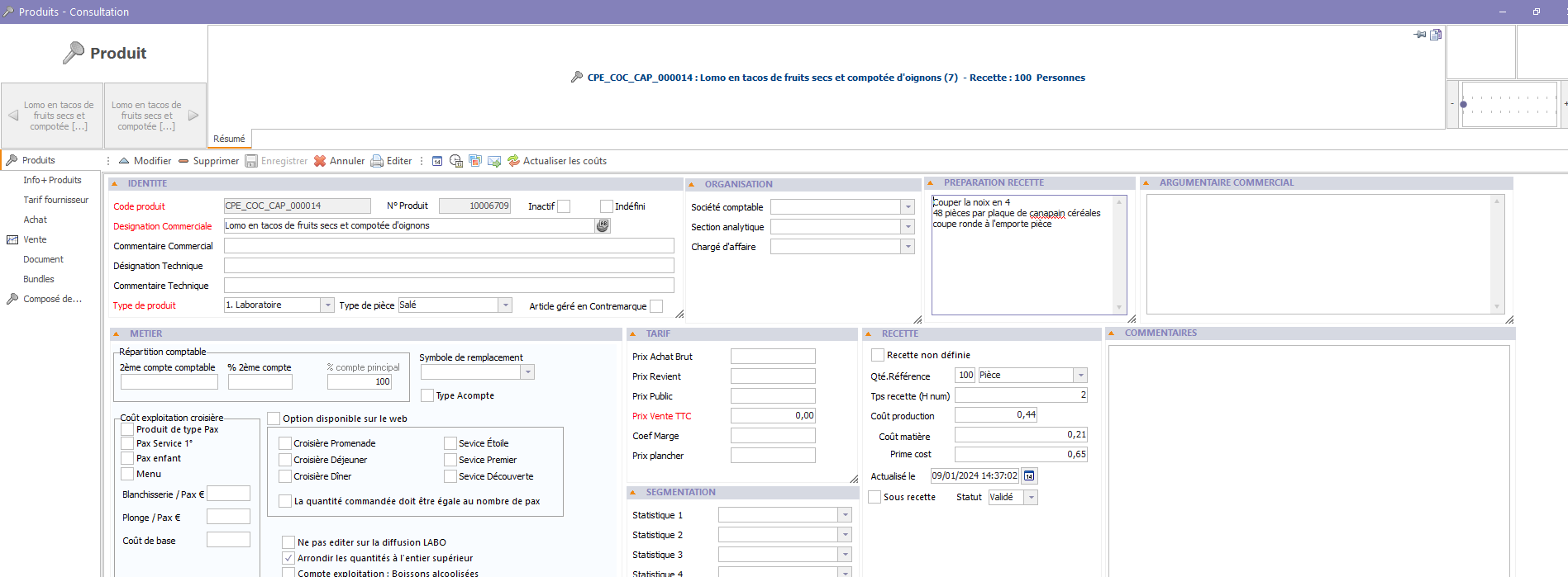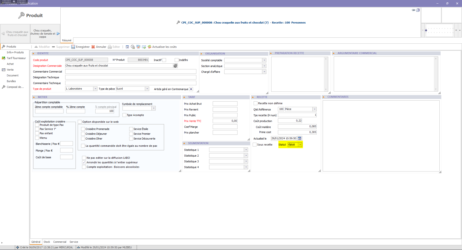 Si des données vous semblent cohérentes (cout de production / cout matière) vous pouvez attribuer le statut de la recette à "Validée" afin d'isoler les recette dont les données ont été validées :