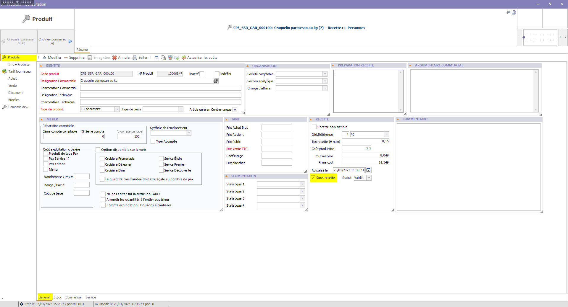 - Préparation recette : commentaire affiché sur la fiche technique de la recette à destination de la production (montage, étapes, conseils...).