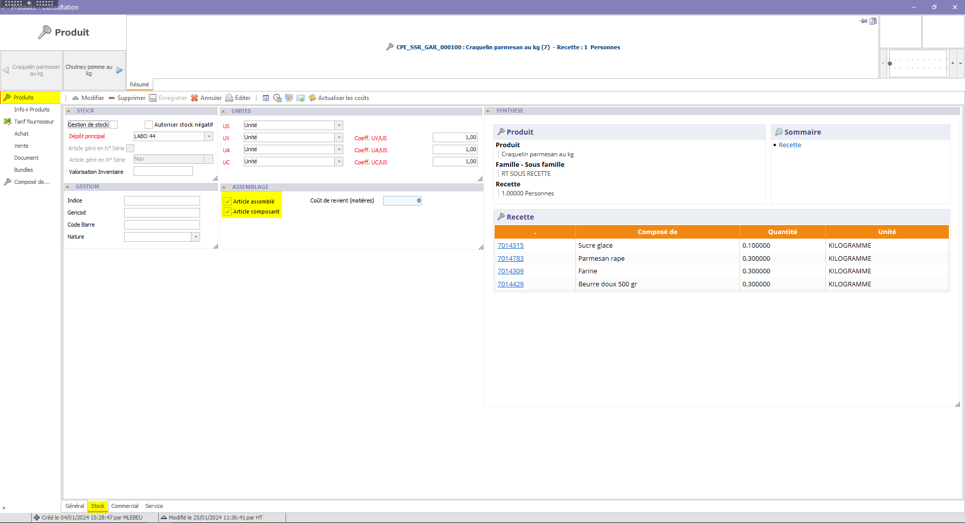 - Avoir les cases "Article assemblé" et "Article composant" du menu "Produits", onglet "Stock", activées :