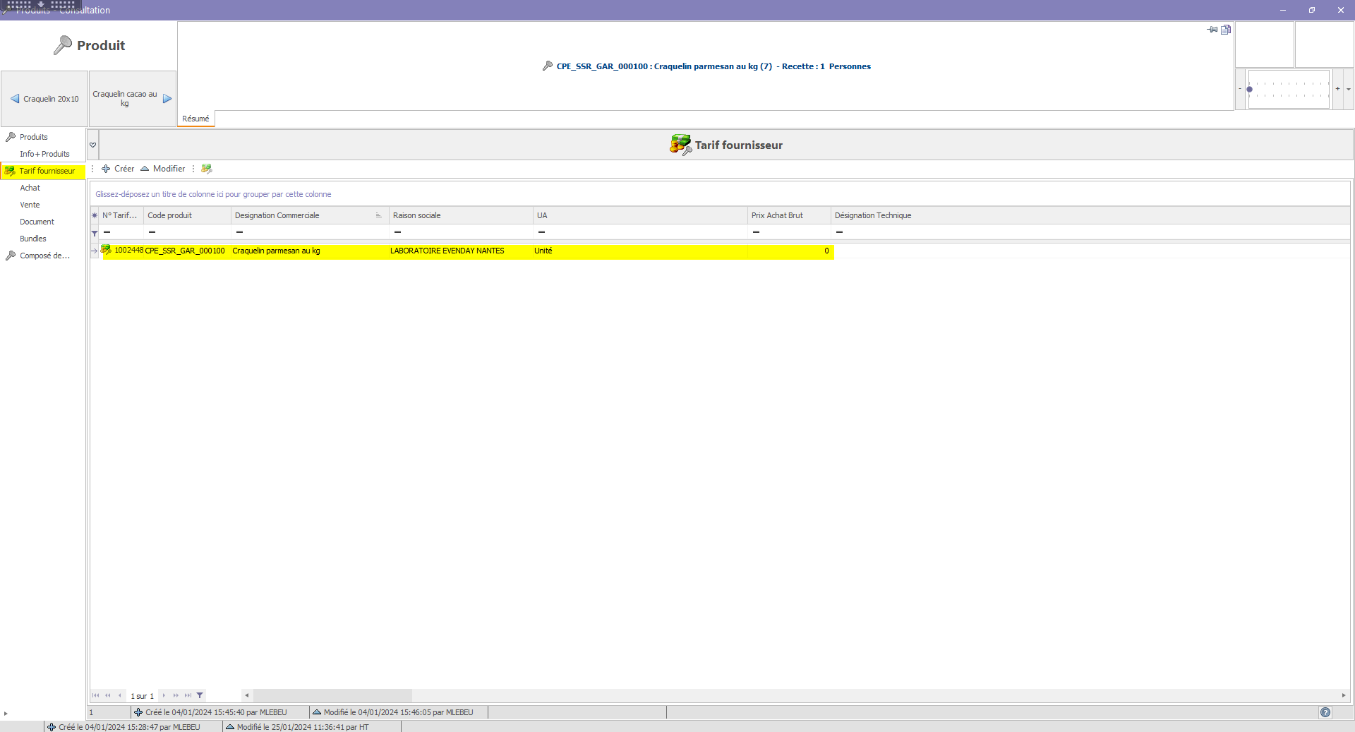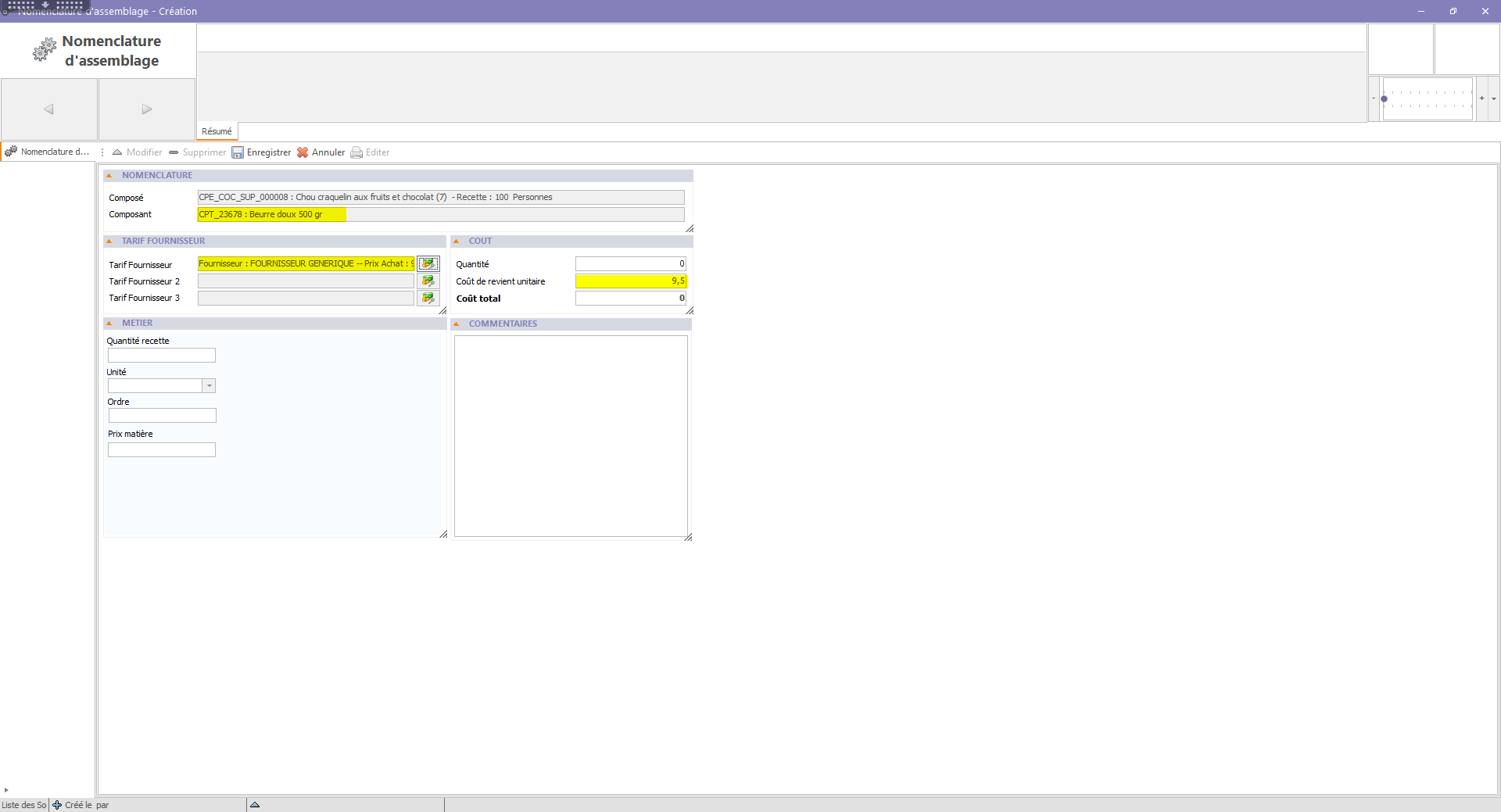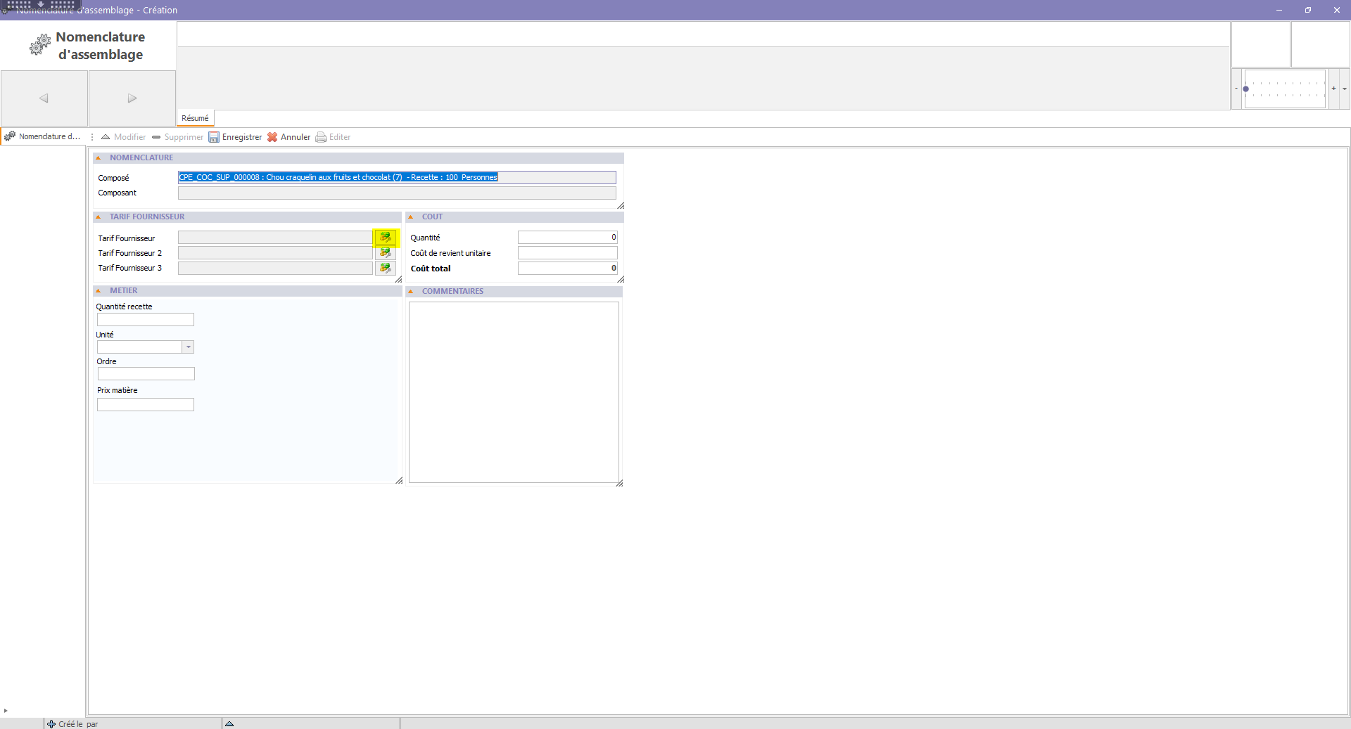 - Avoir un tarif fournisseur renseigné (à 0 car les couts de la recette seront ramenés) :