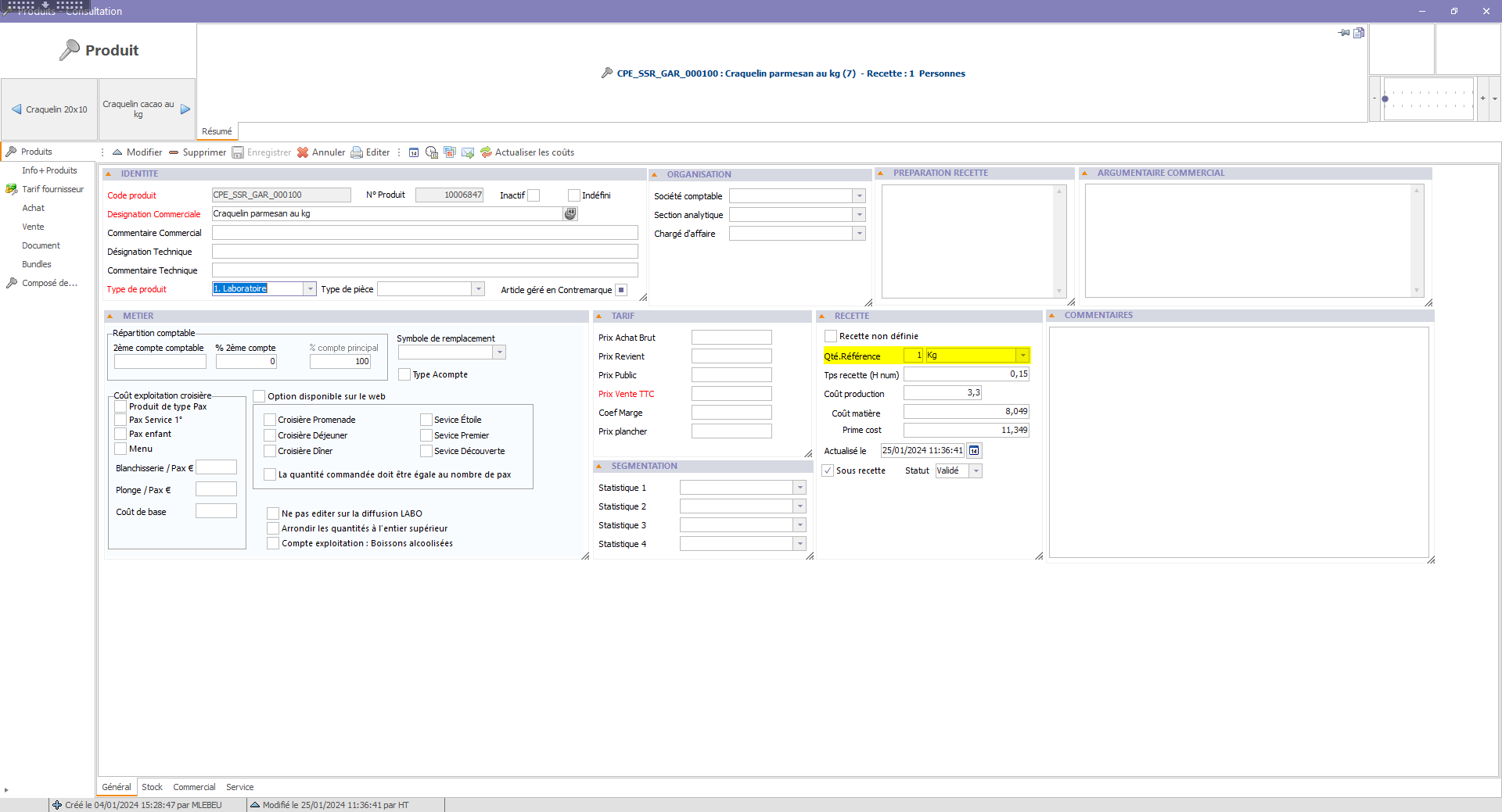 - Qté Référence : par convention = 100 Pièce (sauf pour les sous recettes).