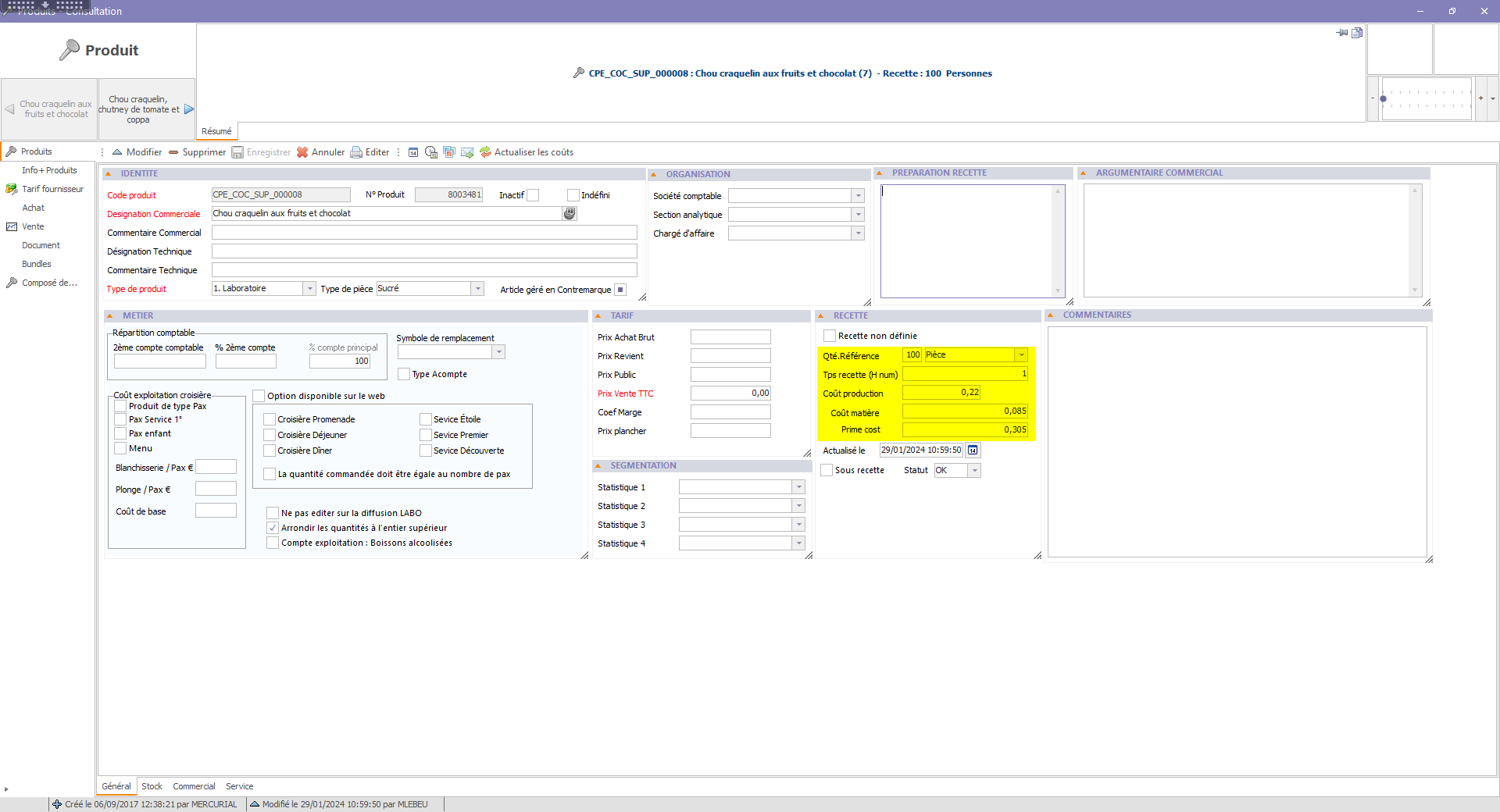 - Prime cost : la somme du cout de production et du cout matière. Attention si vous rentrez un prime cost manuellement non cohérent avec les coûts de production et matière de la recette celui-ci sera écrasé au moment.