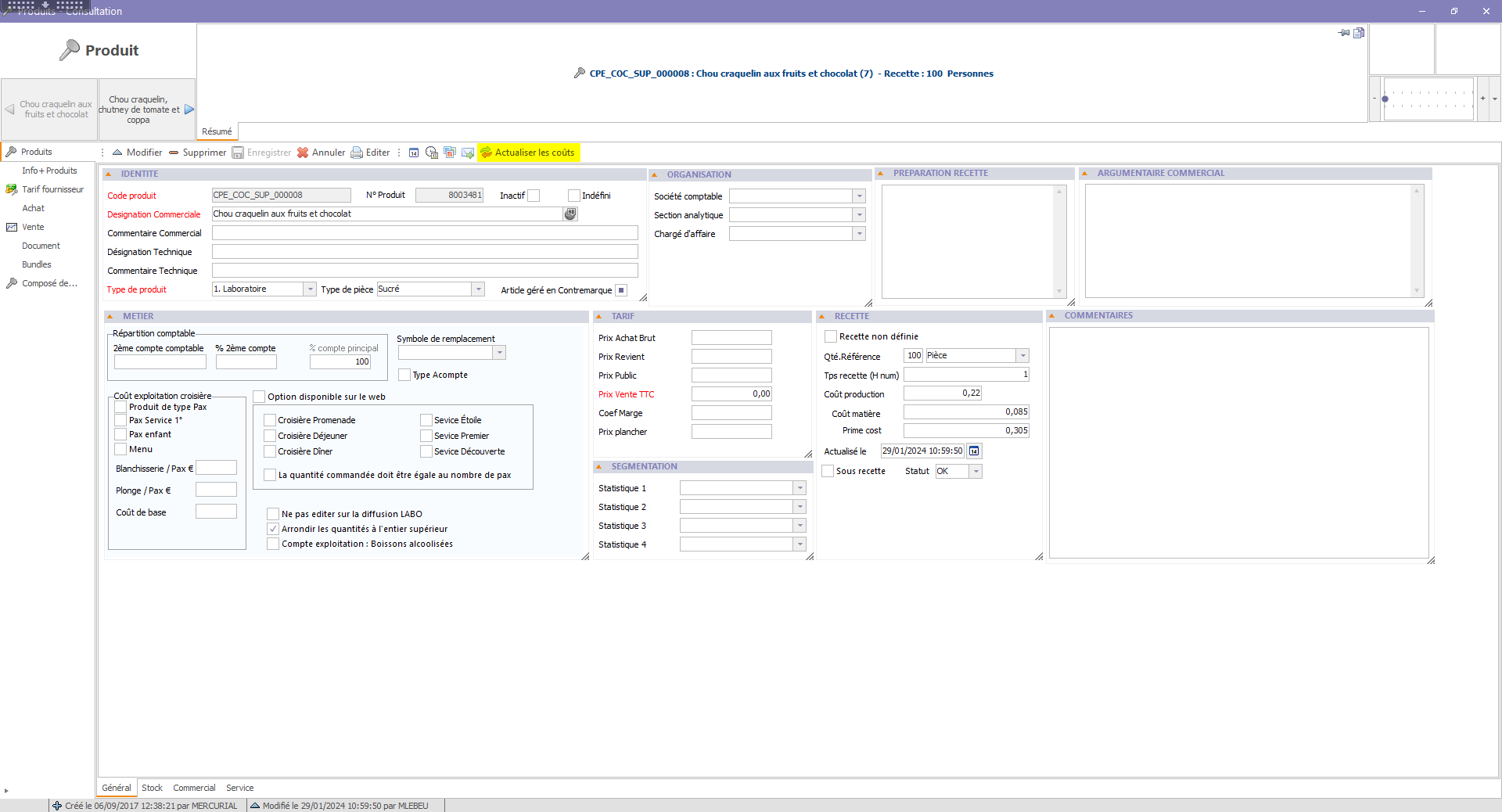 Logiquement vous avez renseigné toutes les informations nécessaires. Il ne reste plus qu'à actualiser les coûts de la recette pour vérifier que tout est bien paramétré :
