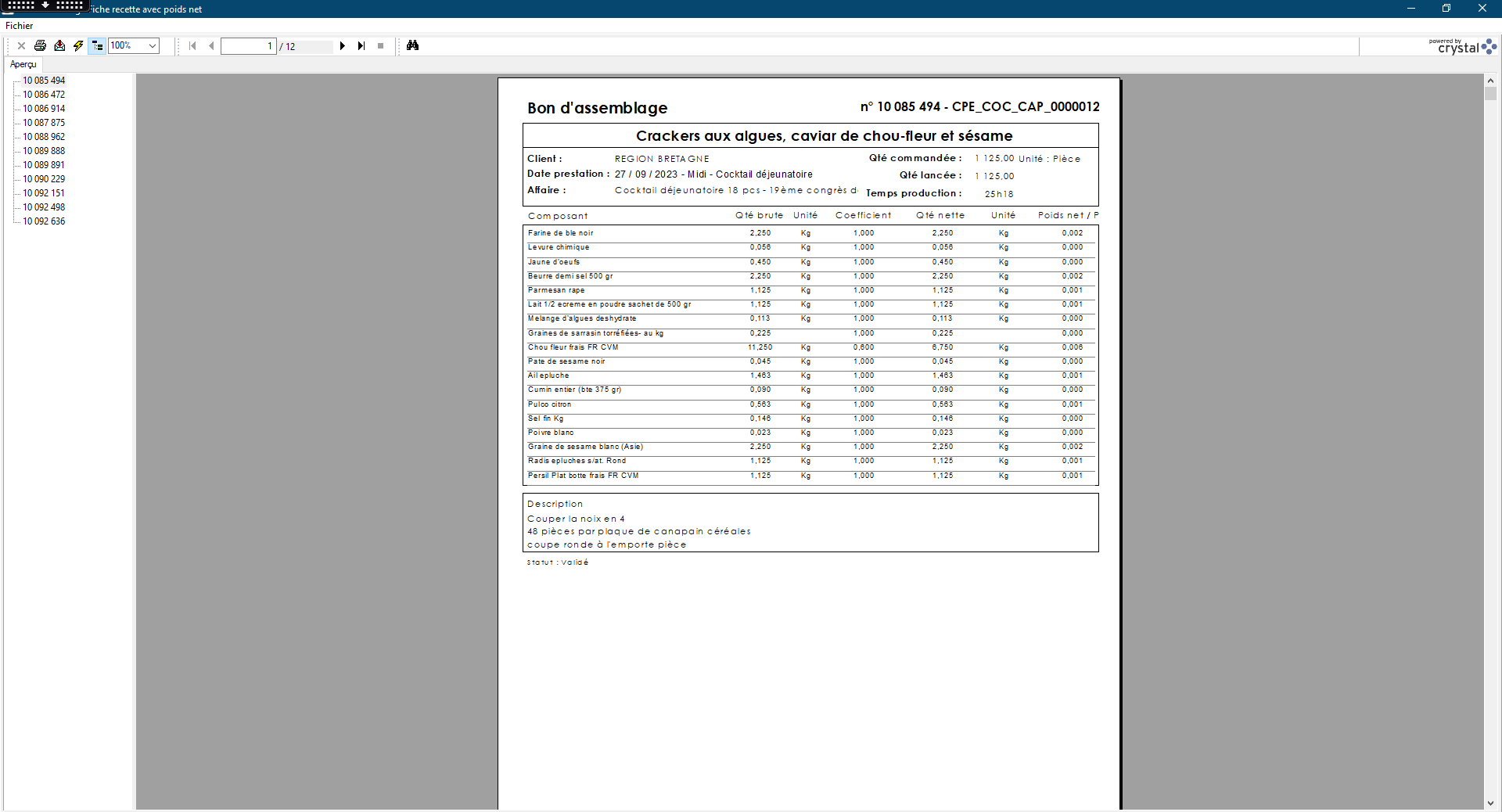 En choisissant le modèle "Bon assemblage Fiche recette" puis en cliquant sur "Aperçu" il est possible de visualiser la liste fiches recettes correspondant aux bons d'assemblage prévus :