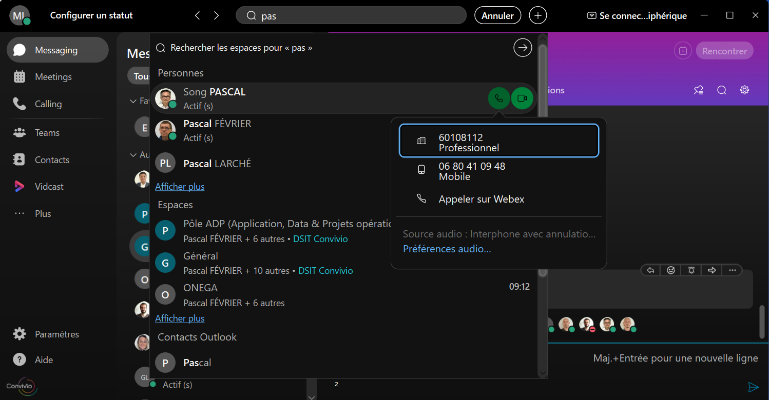 Quand cela est renseigné vous avez la possibilité de choisir entre le numéro professionnel, le mobile et directement sur Webex.