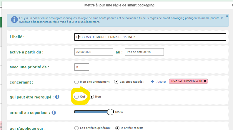 Le fonctionnement des règles de smart packaging qui peuvent être regroupés a été modifié. Ainsi il sera nécessaire de modifier les paramétrages de quelques centaines de règles (sur les 5000 existantes). Ce qui n'est faisable qu'après la montée de version. Nous essayerons de réaliser le nécessaire à temps mais vous pourrez voir des problèmes du type absences de Convive et de grammage dans les conditionnements. N'hésitez à nous contacter dans ce genre de cas :