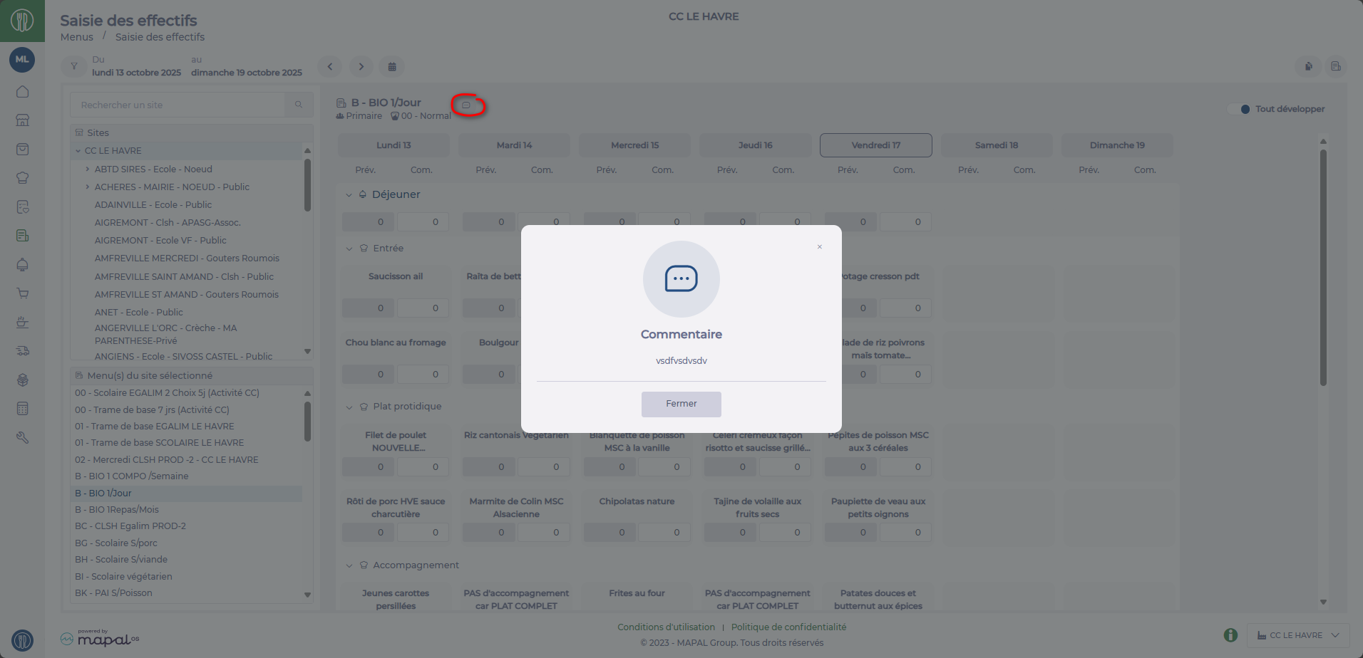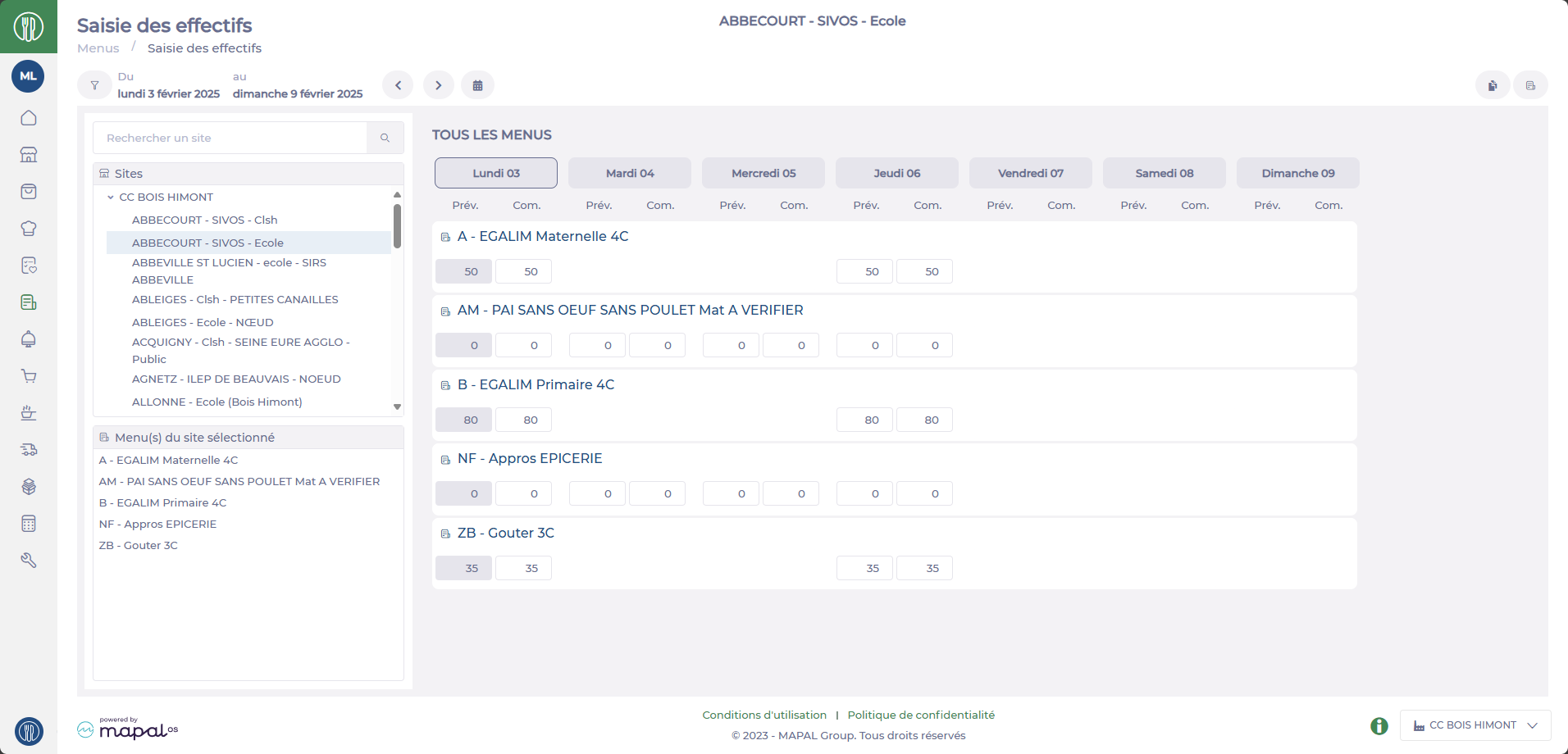 Depuis le site de la "CC BOIS HIMONT" je vois tous les sites de livraison de ma CC ainsi que les trames de menus du site sélectionné. Pour chacun de ces éléments sélectionnés je peux saisir les effectifs pour chaque jour de la semaine :