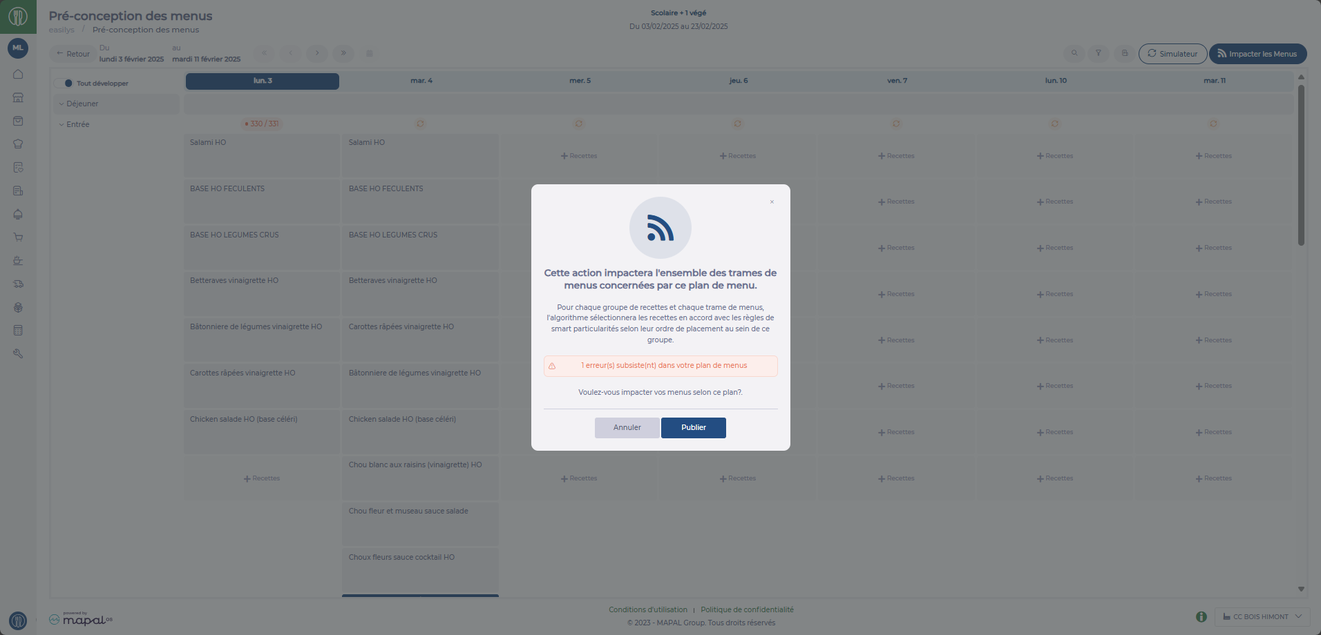 Une fois la simulation effectuée et les exceptions gérées il est possible d'impacter les menus :