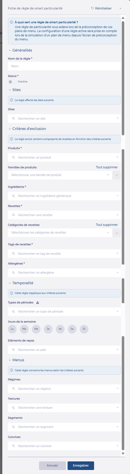 La smart particularité permet de gérer des règles sur des critères d'exclusion afin d'interdire certaines recettes, produits, à certains sites :