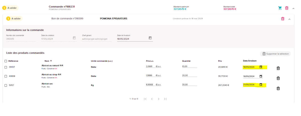 Au clic sur le bouton "valider la commande" il sera produit autant de bons de commande qu'il y a de dates différentes pour un fournisseur.