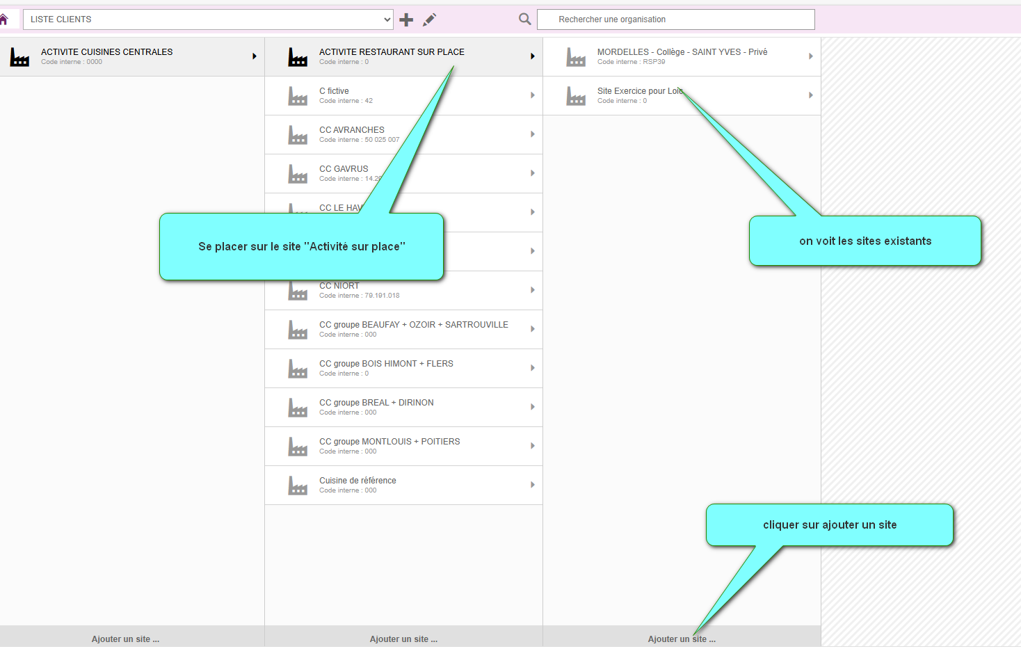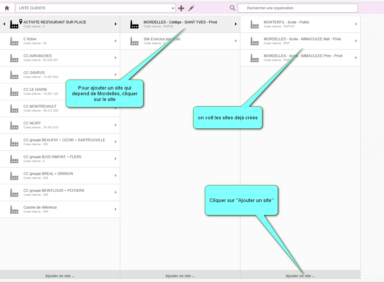 Se placer sur le site activité sur place, on visualise les sites existants dépendant du site dans la colonne de droite,