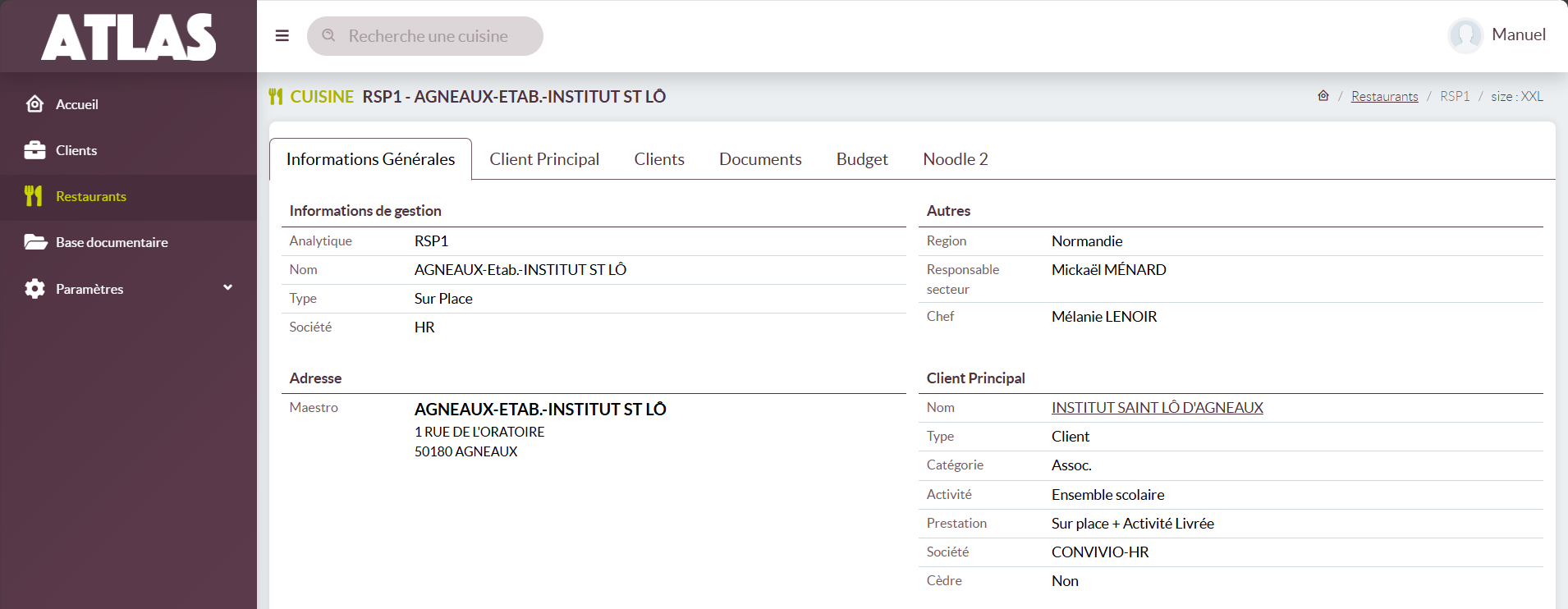 Si vous cliquez sur la ligne d'un restaurant vous pouvez accéder aux informations générales de ce restaurant :
